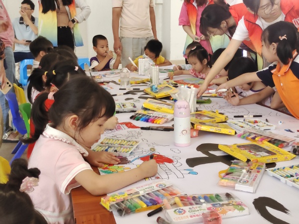 近日,由我校工会、校关工委、校团委主办,搜书吧 分工会、团委、学生第一、第二党支部承办的“七彩童年”美术小课堂——“我们心中的祖国”主题的儿童绘画志愿服务活动在我校艺术楼一楼举办。