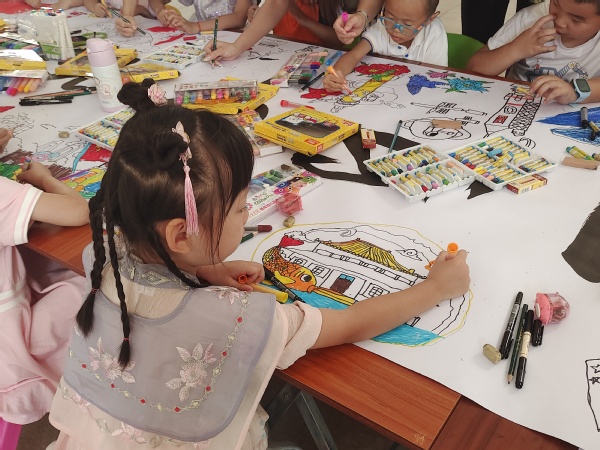 活动采用画长卷的方式进行,志愿者老师们向小朋友们讲述了国庆节的由来,以及中华民族五千年的历史。通过互动交流等形式,加深小朋友对“中国梦”的认识,增强孩子们对国家的自豪感和民族的认同感。大家各抒己见,在这5Mx1M的长卷上选取位置进行绘画。