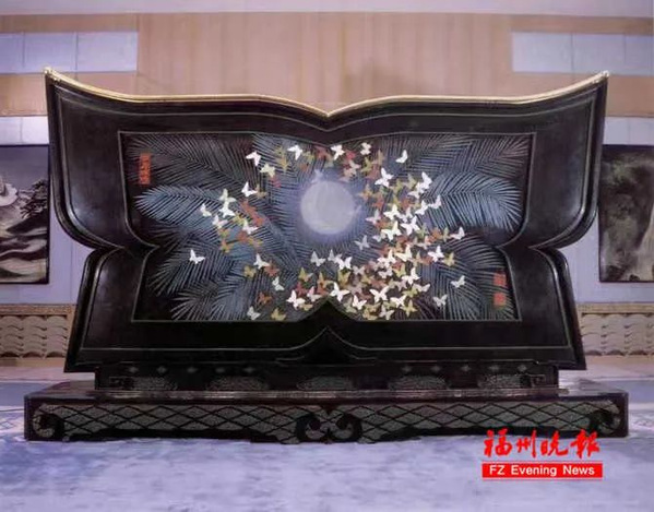 漆画屏风《宝岛蝶情》,外形为蝴蝶,代表着有“蝴蝶王国”之称的台湾省。画面中,一群蝴蝶在日月同辉的光影中翩翩飞舞,寓意着祝愿祖国统一的心愿。在技法上,他将装饰画技法与漆画技法融于一体,代表着工艺的传承与创新。