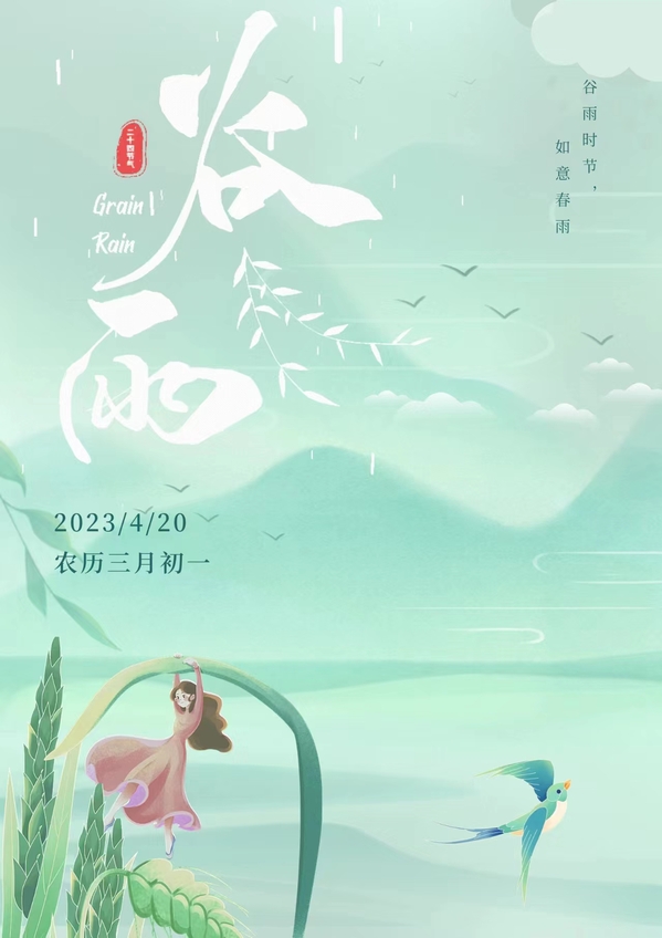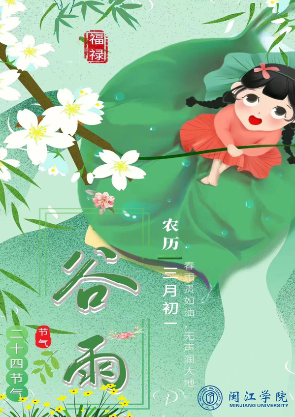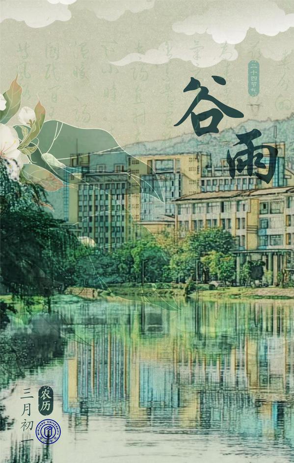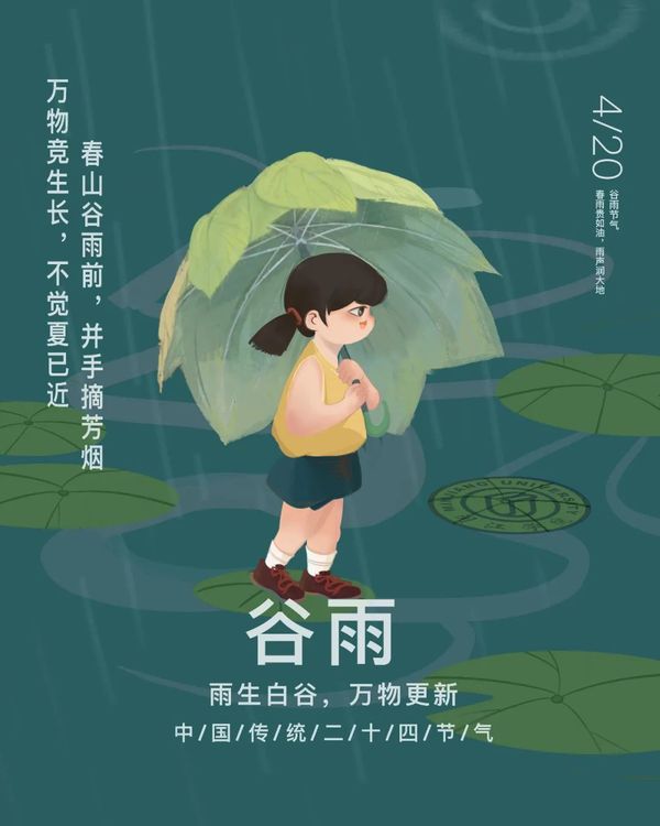 谷雨,谷雨是二十四节气的第6个节气,也是春季的最后一个节气。谷雨,谷得雨而生也。《月令七十二候集解》云:“三月中,自雨水后,土膏脉动,今又雨其谷于水也。雨读作去声,如雨我公田之雨。盖谷以此时播种,自上而下也。”谷雨与雨水、小满、小雪、大雪等节气一样,都是反映降水现象的节气,是古代农耕文化对于节令的反映。古人将谷雨分为三候:一候萍始生;二候鸣鸠拂其羽;三候为戴胜降于桑。民间在谷雨节气有摘谷雨茶、走谷雨、祭海、吃春、赏花等习俗。值此谷雨时节,搜书吧 社团管理中心组织同学们共同创作了“我们的节日·谷雨”系列海报,为这个特殊的节气又增添了一丝艺术气息。