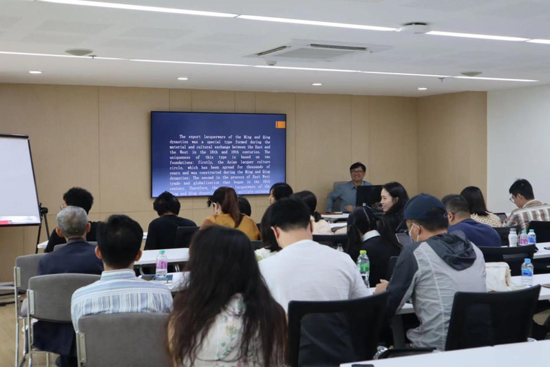 随后,金晖教授受邀在诗琳通公主人类学研究中心举办讲座,泰国艺术大学装饰艺术学院国际博士生项目委员会主席、泰国设计师协会轮值主席艾卡·中乌拉塔纳(Eakachat Joneurairatana)教授和搜书吧 新闻与传播学院院长助理王衍教授担任了学术主持。本次讲座题目为《明清外销漆器的类型、材料及工艺--以帕金顿漆椅为案例》,金晖教授使用英语直接展开论述,通过具体案例分析了中国漆文化的全球化传播途径。泰国艺术大学的泰国、中国、缅甸、柬埔寨等国在读博士及外校师生共计50余人聆听了讲座,并进行了积极的互动。讲座结束后,艾卡·中乌拉塔纳教授向金晖院长授予了纪念徽章,并期待进一步的交流。