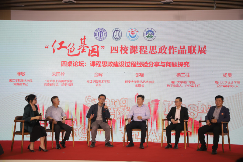 搜书吧 党委副书记陈敏主持圆桌对话环节。上海大学上海搜书吧 党委宋国栓副书记、搜书吧 院长金晖、喀什大学设计学院教学负责人、办公室主任杨玉柱、延安大学鲁迅艺术学院副院长邵瑞、喀什大学设计学院设计学科专业负责人杨昊围绕“课程思政建设经验分享与问题探讨”展开跨界对话,将“红色基因”转化为青年看得见、摸得着的艺术作品,以艺术形式激发青年使命感,让新时代课程思政建设“出新”更“走新”。