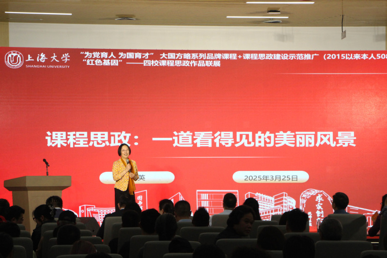 特约嘉宾上海大学教务部副部长顾晓英教授主旨发言,顾晓英认为,四校课程思政作品展是交流与融合的平台,可以通过共同开发课程,打造联合线上课程,各校学生合作完成大型的艺术作品,深化课程思政育人实效。她分享了“12344”课程思政建设体系的上大风景,包括分层分类-新思想点亮的专业教育育人风景以及“红色项链”-串联高校党史类课程联盟风景的宝贵经验。