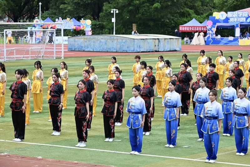 美院学子身着黑底红龙纹南拳劲装蓄势待发,千人健身操燃动全场、惊艳师生。南拳刚劲与太极圆融相得益彰,一招一式尽显国风底蕴,尽显少年意气与传统之美。