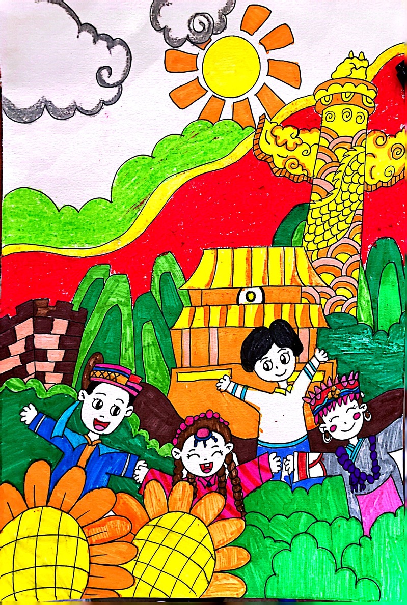 一幅幅色彩斑斓的画作最终呈现在大家眼前,这些作品充分展现出小朋友们独特的创作思维。画作是一扇通往他们内心世界的“窗户”,一幅幅作品展现出小朋友对民族团结的认识。