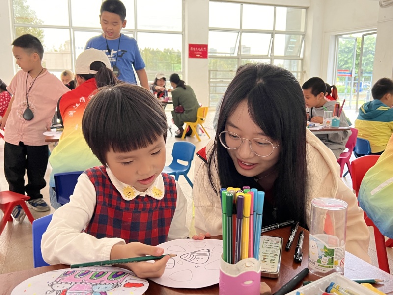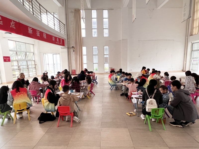 油纸伞的伞骨为竹,竹报平安,寓意节节高升,图案以传统国画常见题材为主,如花鸟、山水等。小朋友们围坐桌前,手握七彩画笔,一笔一画都蕴藏着对油纸伞的喜爱。在志愿者的指导下,一个个精美的油纸伞在画纸上逐渐成型。